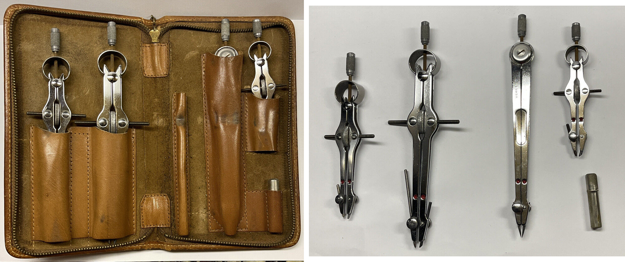 Top grain genuine leather case with bright chrome: C-410, C-110, C-230, F-328, P-314, lead/spare parts capsule. NOTE: the P-314 Microliner Ruling Pen is missing from this photo.