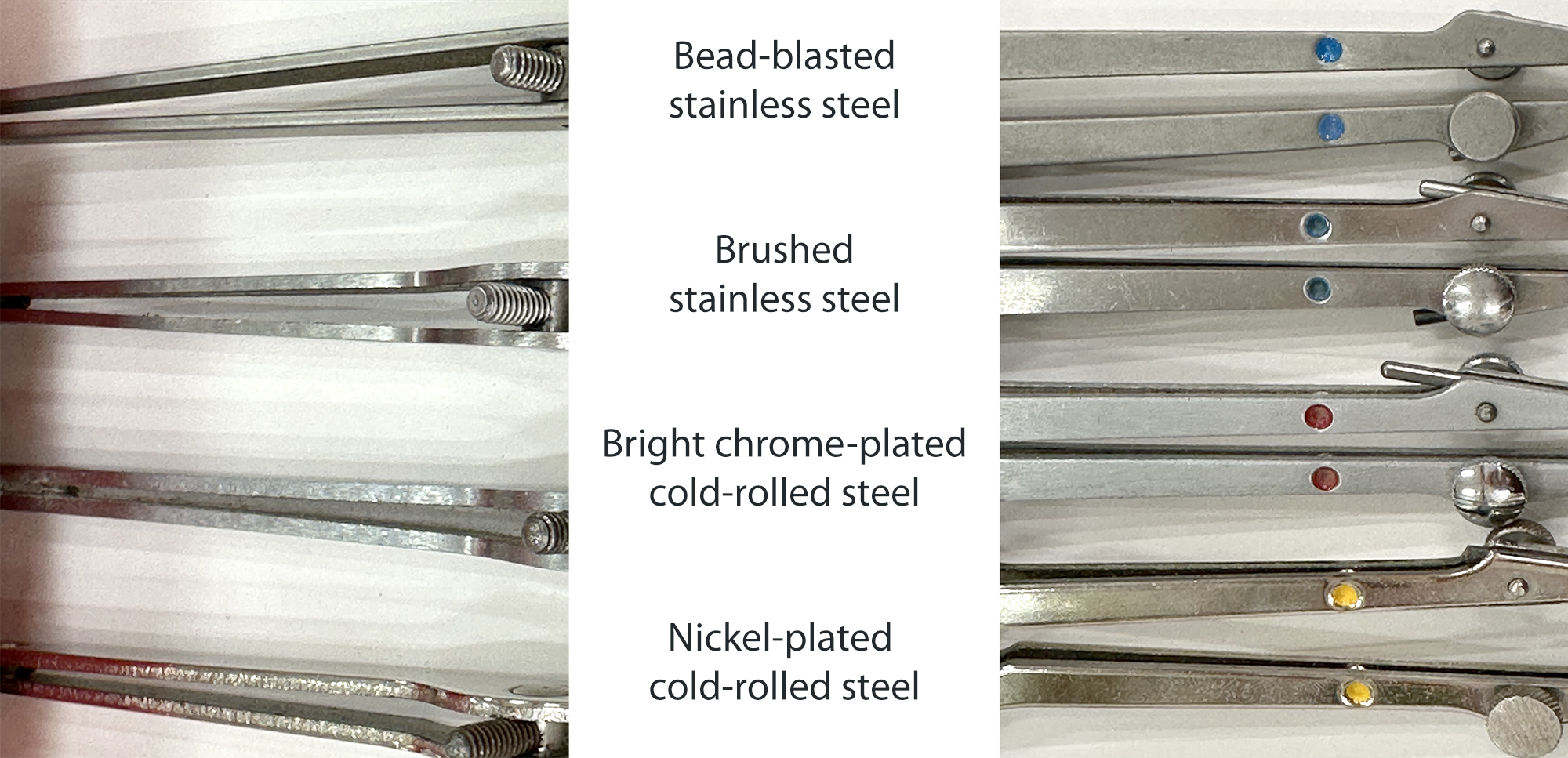 As mentioned on my page, "About Vemco Compasses", because Yellow Dot and Red Dot instruments were made from cold-rolled steel, they needed plating to avoid rust; whereas Blue Dot instruments did not. Stainless steel is naturally corrosion-resistant. As can be seen below, the various finishes took on different appearances. You will see that the bright-chrome finish is white/blue in appearance, whereas the nickel finish is yellower. Nickel, being cheaper than chrome, was used on the Yellow Dot instruments.