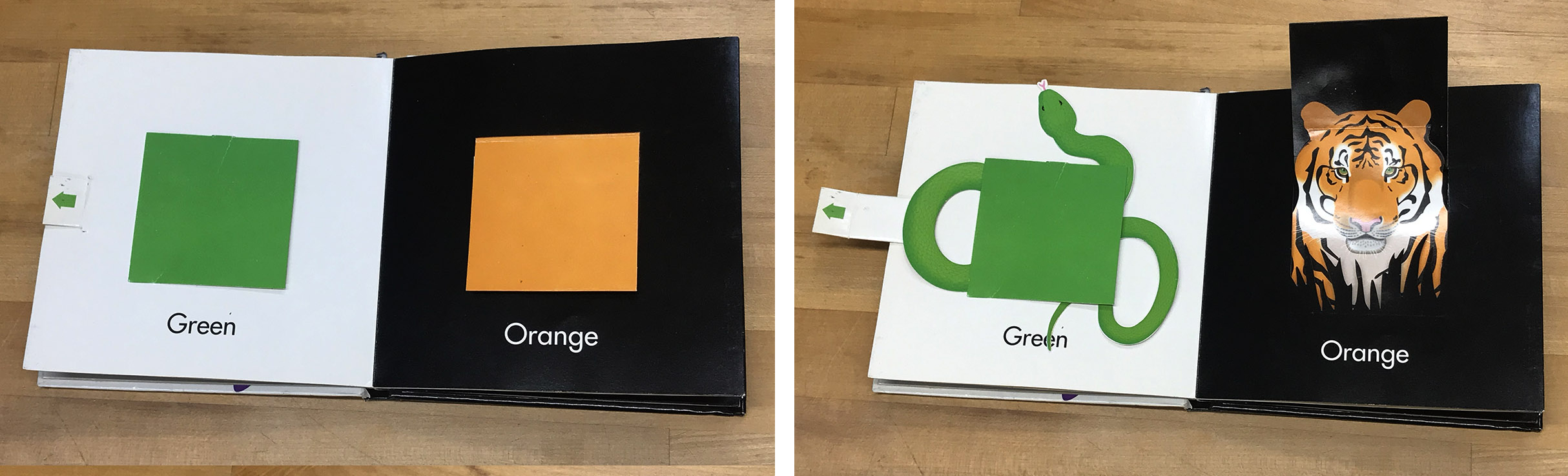 Flaps are merely page folds that are added into an existing spread, and in themselves are the simplest interactive elements to construct. In the sections on pull tabs and rotating wheels, both spreads illustrated also have flaps designed into them. In "Chuck Murphy's Color Surprises", the orange square is a flap revealing a tiger. In Nicole Harden's book on the solar system, the flap reveals a closeup of the moon. In Chuck's book the flap is deliberately highly visible, whereas Nicole's is intentionally hidden. Both are simply squares.