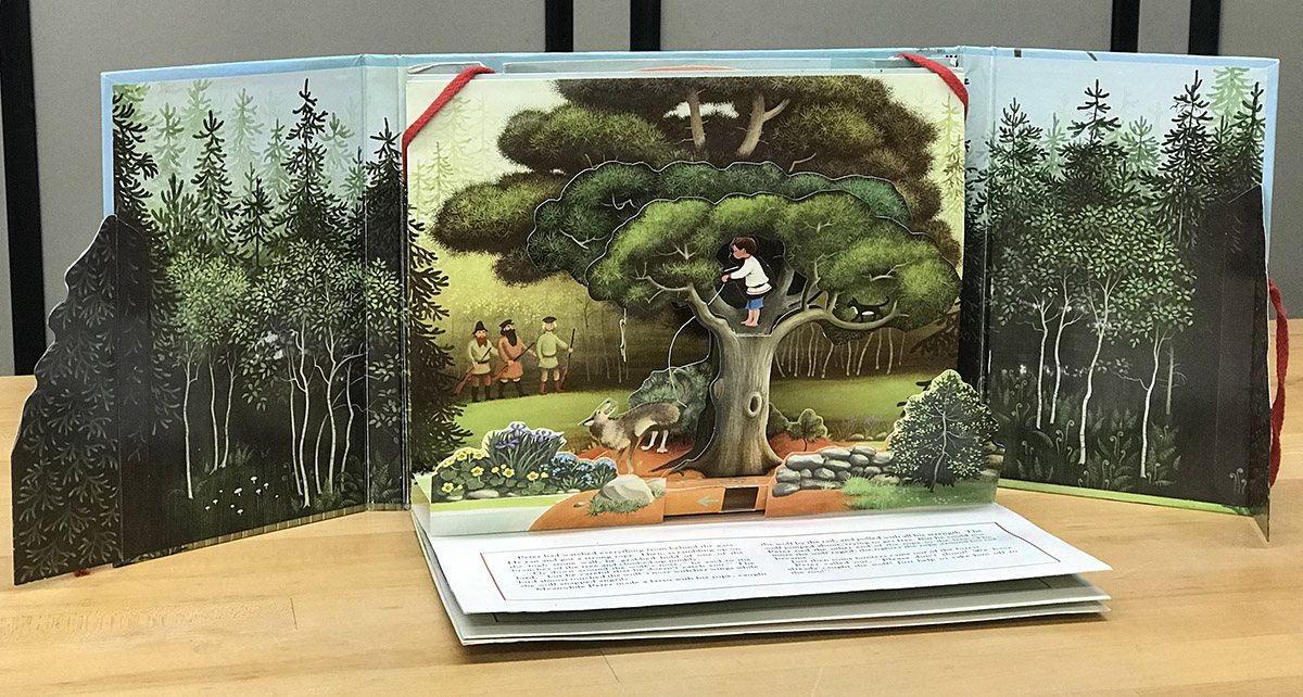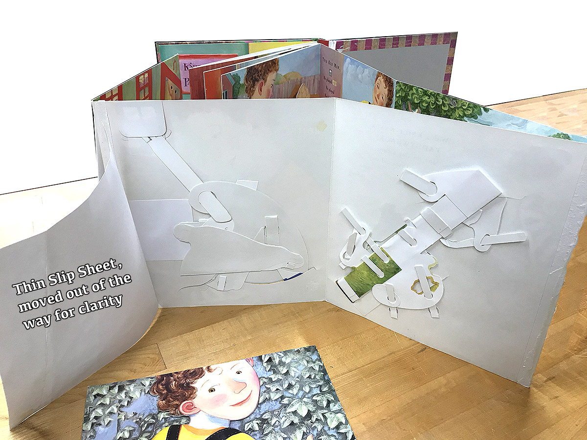 In this example the tube slide is activated by the finger slot, which further moves the boy in the tree and the wolf on the ground. Notice how all mechanisms, no matter their position, will still fold into the book when closed without damage. This is an excellent and reliable design. The finger slot has an arrow showing that the movement is to the left. When moved to the left, a right arrow is revealed. The hard limits, or stops, are the edges of the opening in the scenery flat, allowing for about 2 inches of movement. The tube slide inside the scenery flat is long enough to be strong and provide reliable movement/linkages to the other mechanics, but also small enough not to protrude from the page when slid left or right.