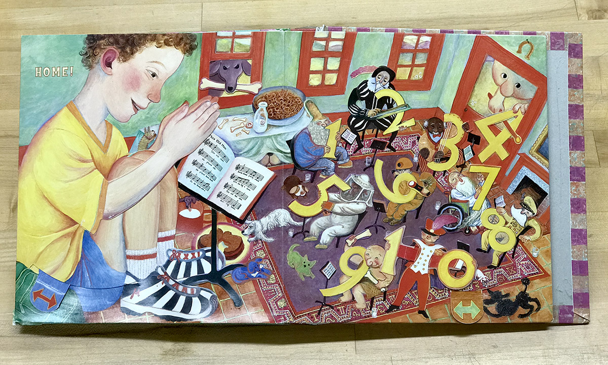 As seen in Knick Knack Paddywhack, there are two rotating tabs on this spread. One is located in the lower left of the left page and has red arrows. This movement allows the boy to clap his hands, and movement is confined to the left page on the spread. The green arrowed rotating tab on the lower right of the right page activates an astonishing array of mechanisms related to each numbered creature. Below is an image showing the 'behind the scenes' action that takes place between the leaves of the book. As incredible as this design is mechanically, it is visually very cluttered. It is not easy to find the tabs or follow all of the actions. The artistic style seems to get in the way of the mechanical aspects.