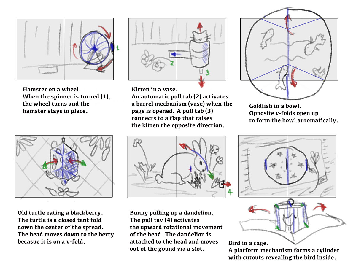 The example storyboard above uses lots of different mechanical elements. On the first spread, there is a rotating wheel activated by a cutout on the right edge of the spread. Because the mechanism has to be on one side of the fold line, there is little activity on the left half of the spread. Either another pop-up mechanism can be added there, or the space can simply incorporate another visual element to complete the composition. For example, a hamster water bottle. The art should fill the entire spread so the eye is carried all around to alight on different aspects of the mechanisms, text, and illustrations.
