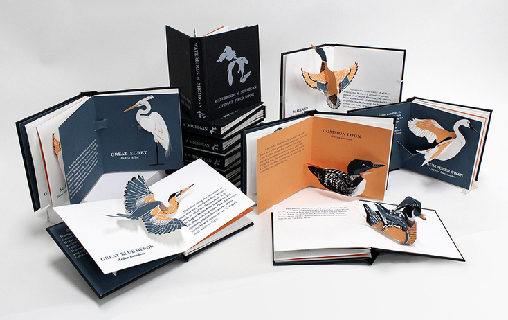 Waterbirds of Michigan: A Pop-Up Field Book by Esther Licata and Nicholas Danish is a great example of a well thought out limited color palette. Esther is an illustrator and printmaker, and applied her knowledge of color theory to create screenprints using only orange, blue, black, and the white of the page. Orange and blue are complementary and eye catching, while white and black are neutral and create bold contrasts. Note how the orange is a lighter value than the darker, less saturated blue. This gives the colors enough contrast to prevent them from vibrating together painfully.