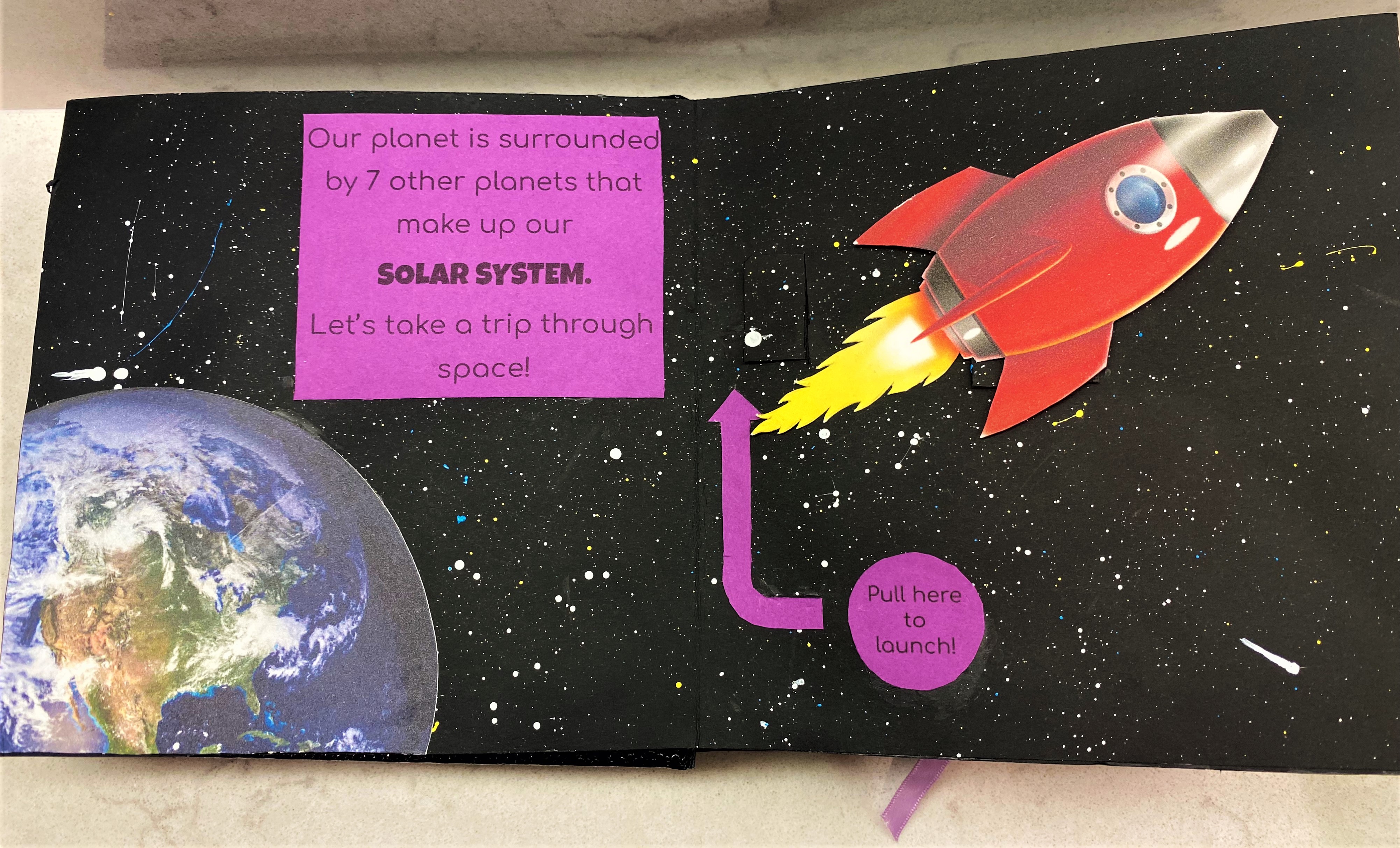 The first thing I see is that she labeled and described every pull tab and lift-able flap to let readers know exactly what will happen. If she instead just wrote "pull" or "lift," there would be a moment of anticipation followed by surprise and discovery. Since science is all about discovering the unknown, this would reinforce the theme of space exploration. She also might consider ways in which to make the rocket launch from the surface of earth itself for greater continuity.