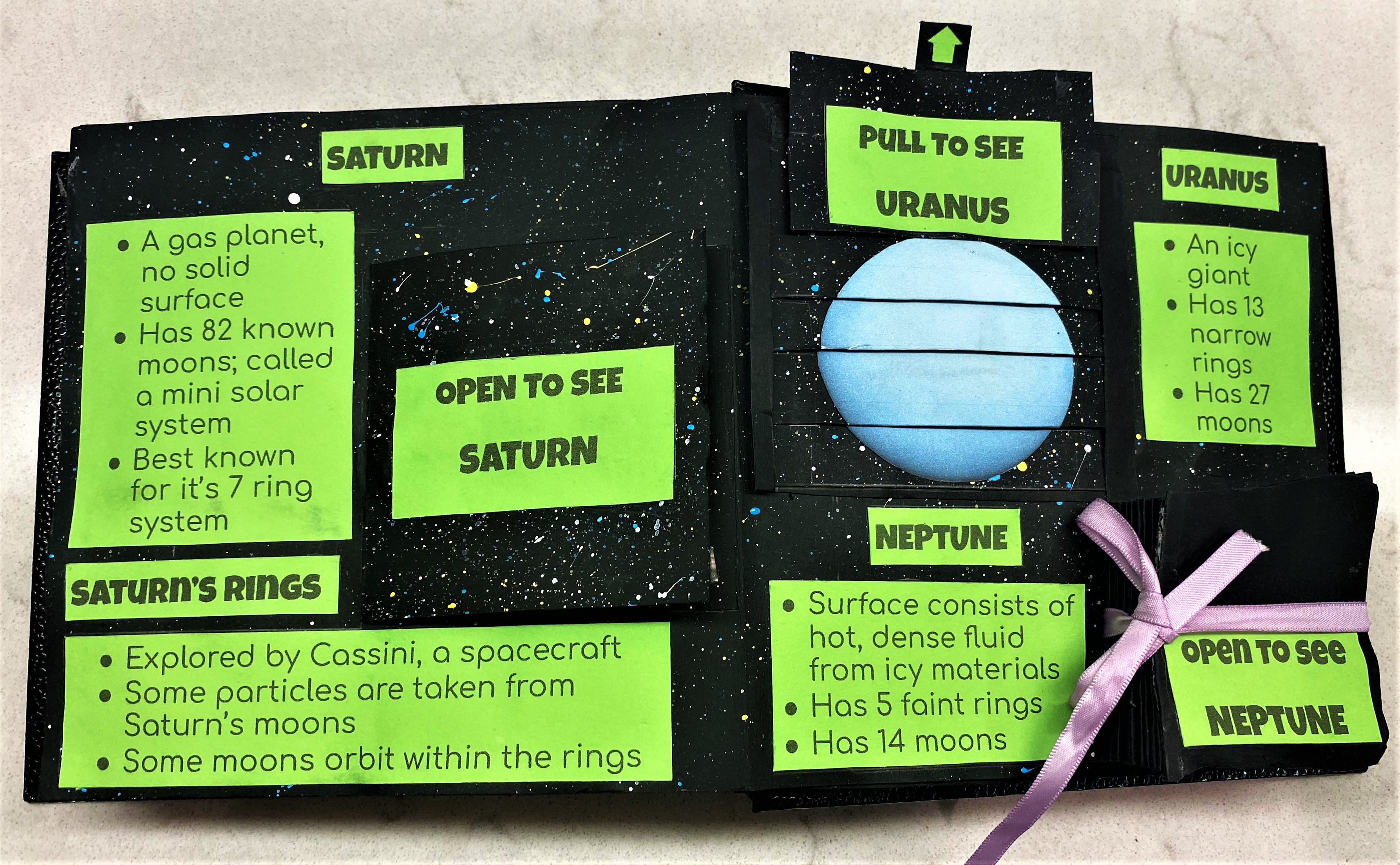 Nicole Harden did a fantastic job on this book. She made a very striking book with a strong cohesive style, using a different color which corresponded to the featured planet for behind the text on each spread to make the color scheme cohesive, and using images from NASA and the JPL that are in the public domain (note the attribution on the first page, and check out the Copyrights page for how to find and use public domain and creative commons images). Because her book is so well done, there is a possibility she might want to pursue publication. If she did that, there are a number of issues she could address to make this a stronger submission for a publication house.