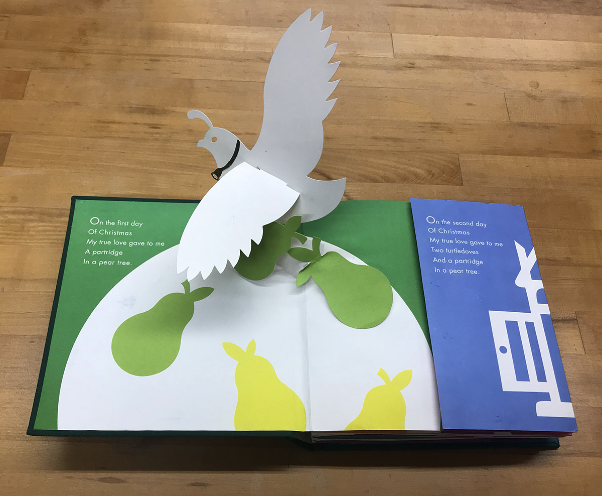 This book makes use of solid, matte colors and white to make a statement. The artwork is crisp. There is a secondary flap to the right on every spread. When opened, another pop-up is revealed. 12 days fits into 6 spreads! Text is white, and is placed over different solid colors throughout the book. The partridge explodes beyond the spread, breaking up the edge of the book. It is meant to be viewed straight-on.