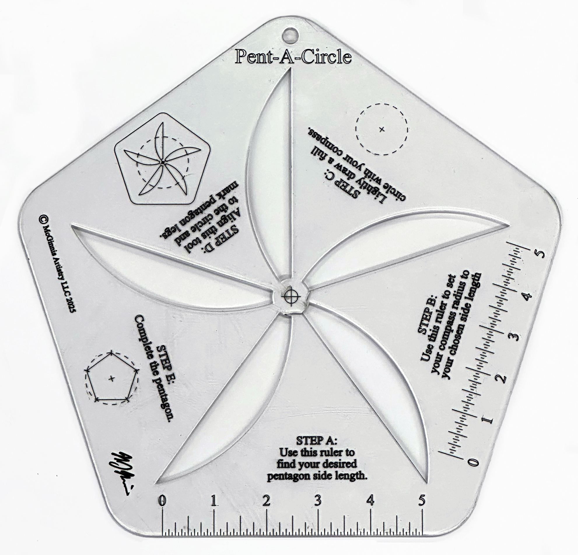 After working on the creations described earlier, I decided to make one more called the "Pent-A-Circle". This version was to let a person draw a pentagon inscribed into a circle. Earlier in this essay I mentioned a compass method on how to draw a pentagon within a given circle, thus why I made this design. It was made from clear acrylic so users could see the circle underneath. Naming my tools follows the same evolutionary process as designing them.