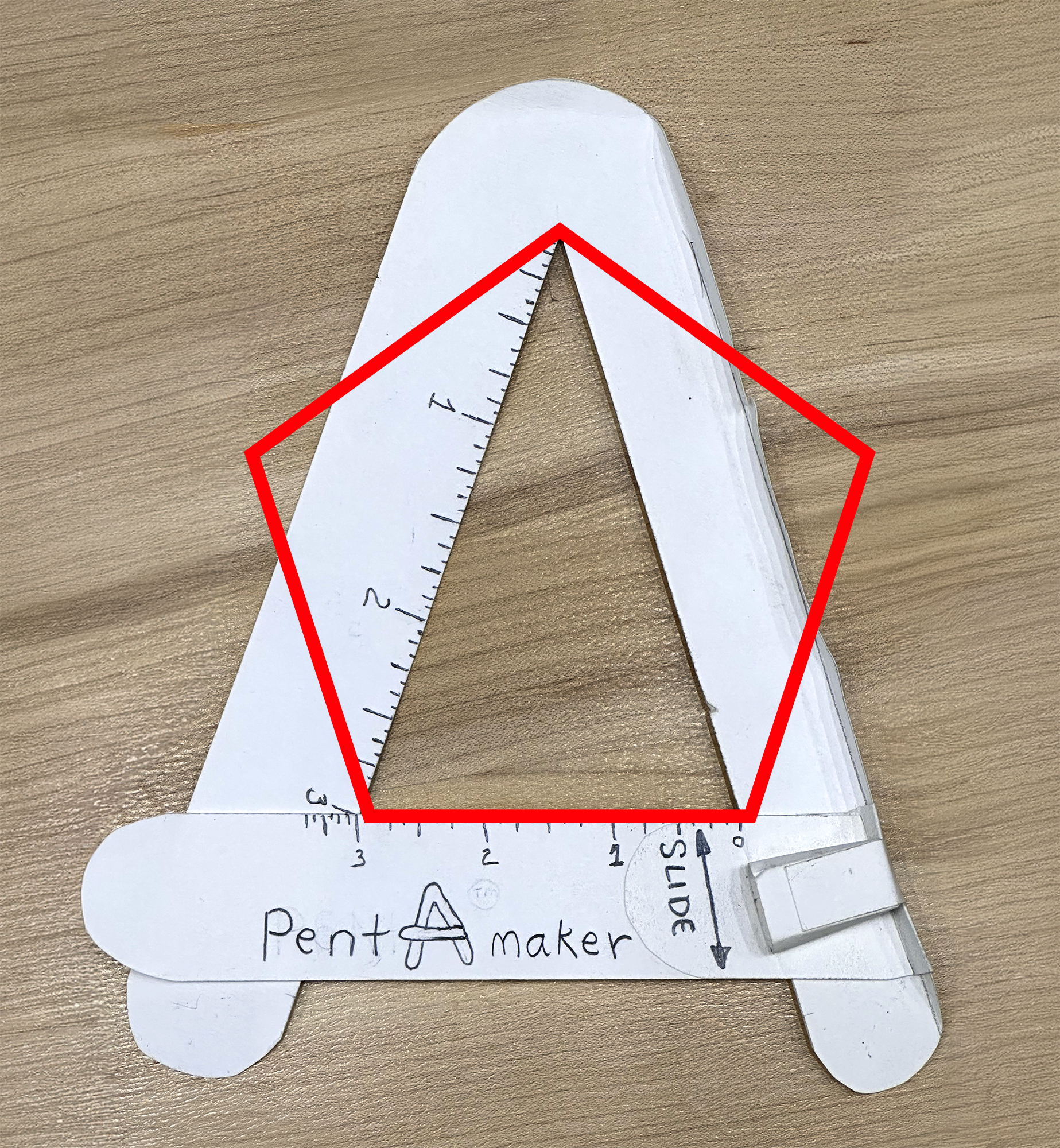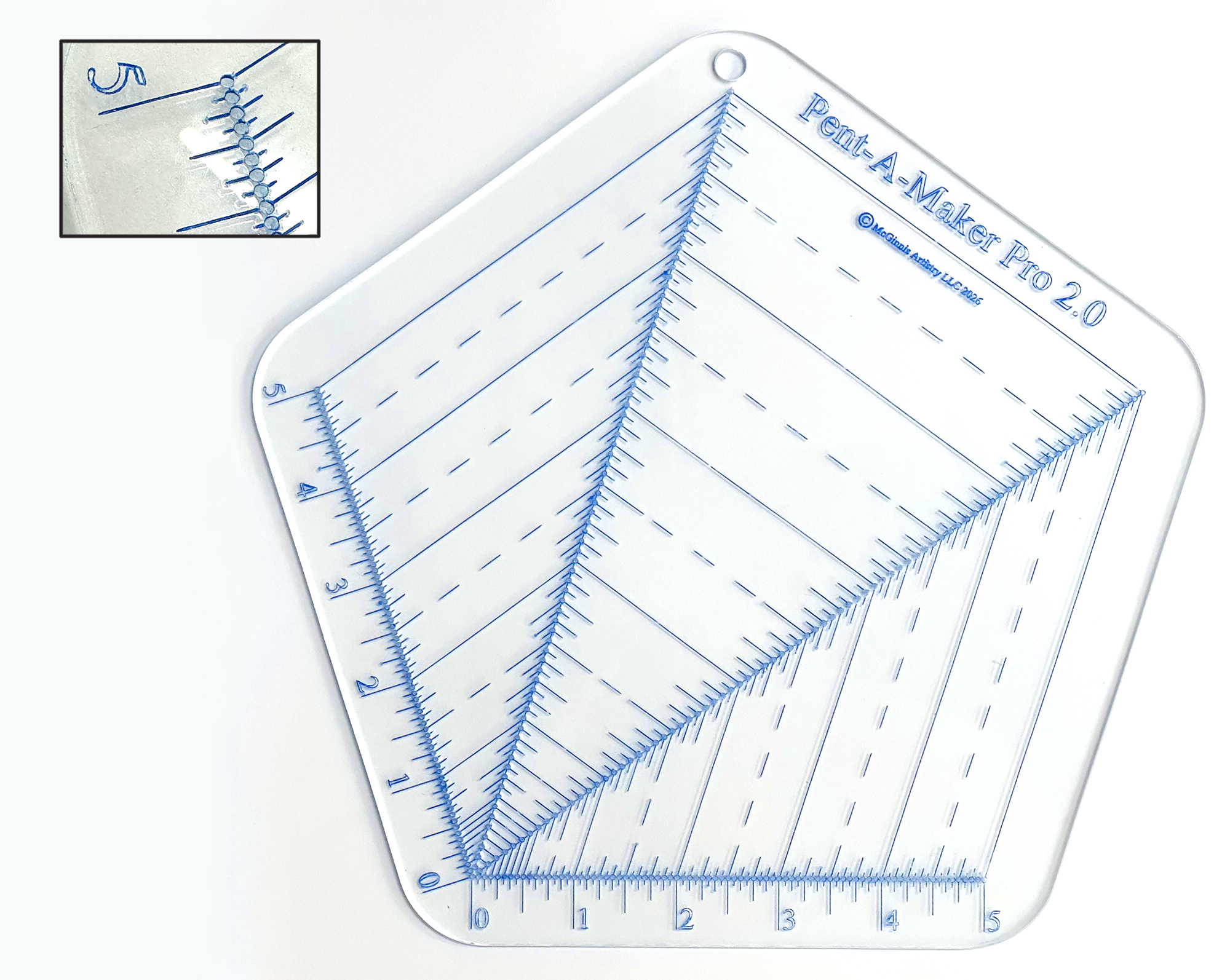 In response to a student saying that she was having difficulty marking an accurate pentagon using the Pent-A-Maker Pro due to parallax, I created the model seen above. Parallax occurs when the distance between a measuring tool and the object to be measured is great enough that looking from any angle other than straight on can make measuring inaccurate. All of the previous wood and acrylic Pent-A-Makers were made with 1/8" thick material. The Pent-A-Maker Pro 2.0 has tiny holes at every 1/16" increment along the various lines, making it possible to use a small mechanical pencil or sharp pin to mark the appropriate pentagon vertices. I laser cut the holes to fit the ferrule of a 0.3 to 0.7mm mechanical pencil. Holes any larger would not have been possible to fit at each 1/16". A benefit of not making large through-cuts in the material is that this design allowed the device to accommodate 5" maximum pentagons (where the previous stopped at 4-1/2") while still being the same overall size as its predecessor.