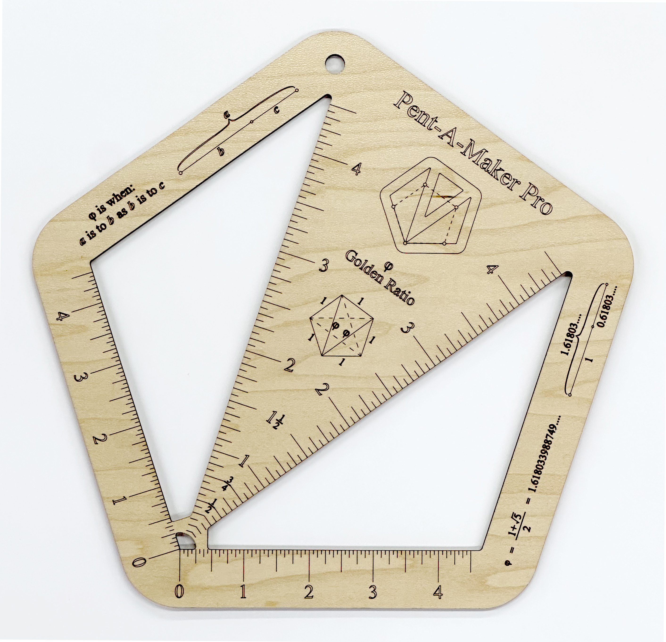 My next iteration came to me when I realized I could add another two legs to my concept utilizing extra standard and golden ratio rulers, making it possible to completely eliminate the compass from the process of making pentagons of any size. This version I called the "Pent-A-Maker Pro". It is effortless to make accurate pentagons of any base length.
