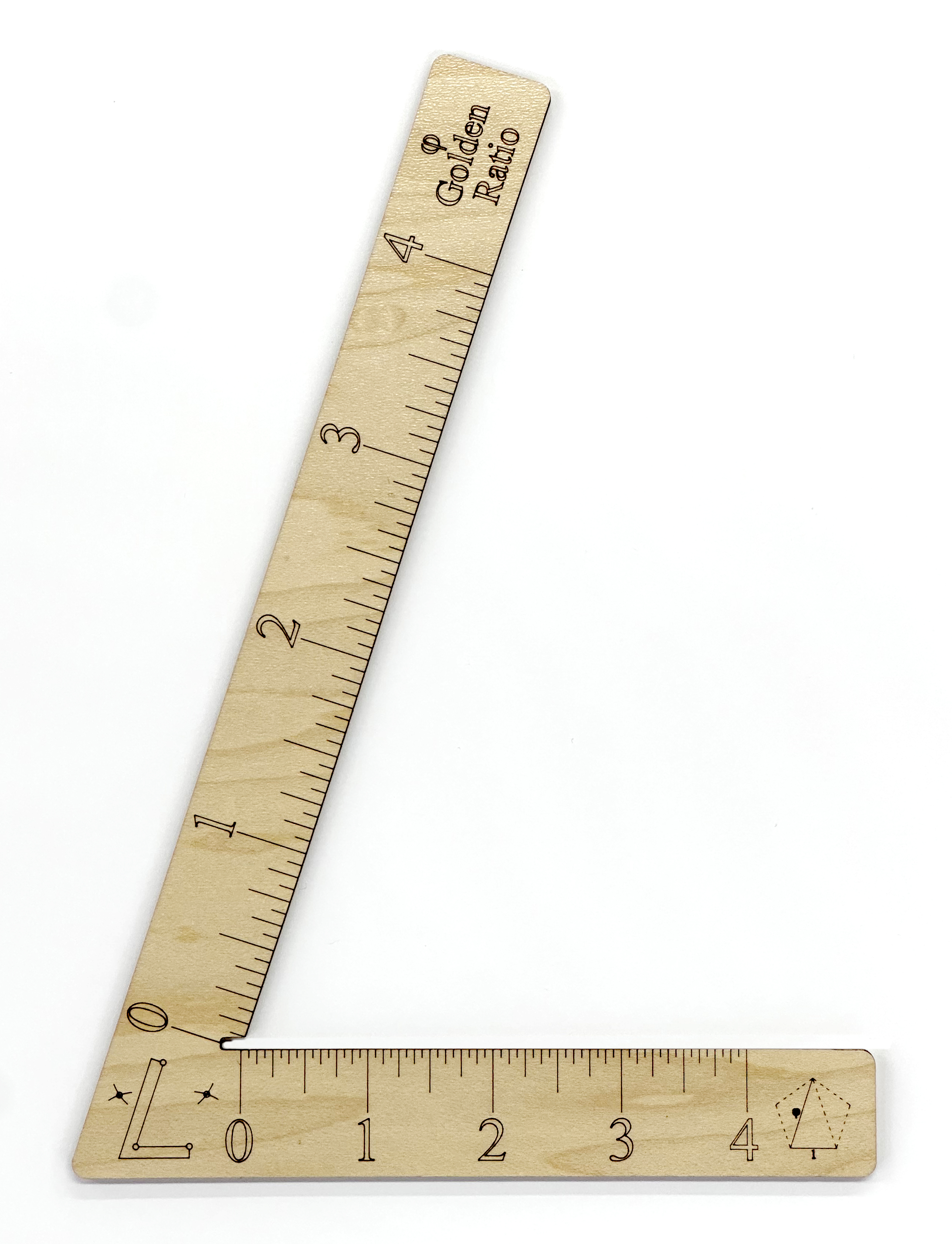 That is when I realized I could eliminate the sliding part of the device by removing one of the diagonals on the A, essentially turning it into a slanted L. Rather than have a slidable part, there would be a standard ruler on the horizontal leg and an enlarged golden ratio ruler on its diagonal leg. That way, one could demarcate the zero point of the pentagon, draw its base to a given length along its horizontal ruler, then mark the apex along its golden ratio ruler. If you wanted a pentagon with a 2" base, all you had to do was draw a 2" line, then mark along the golden ratio ruler at the 2. Of course, you still needed a compass to find the rest of the pentagon. I made a wooden and then white plastic working model of the device, now referring to this new design as the true "Pent-A-Maker". It worked perfectly.