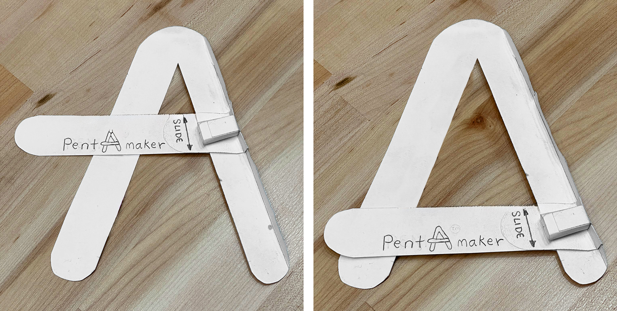 Then I realized I could create a template that was made from an A-shaped triangle of the correct angle (72 degrees) where the horizontal line of the A was slidable up and down. I made a paper prototype, the first prototype in my quest. It was easy and automatic to set any base length, and then locate the apex position perfectly. But with that device, it was still necessary to employ a compass to find the rest of the pentagon's sides. I called it the "Pent-A-Maker", with the "A" logo drawn to look like the tool. Here is how it lays out a Pentagon (with the assistance of a compass). For this last image, I added rulings.