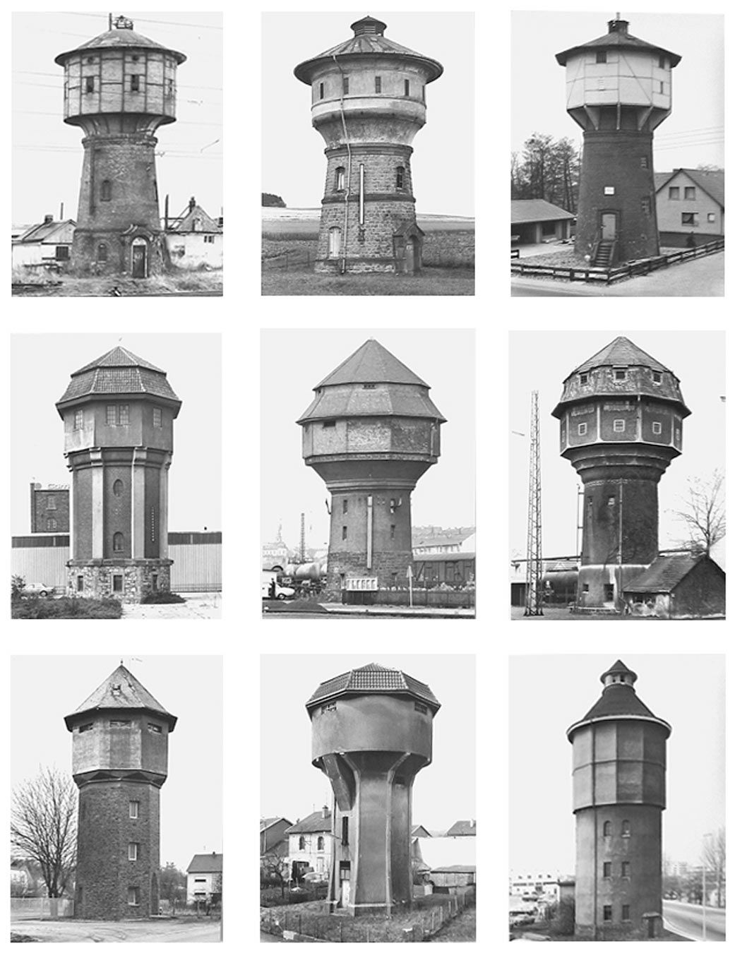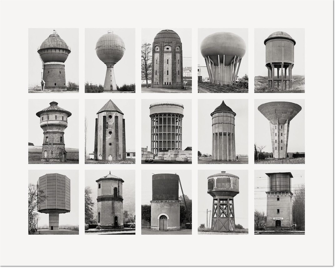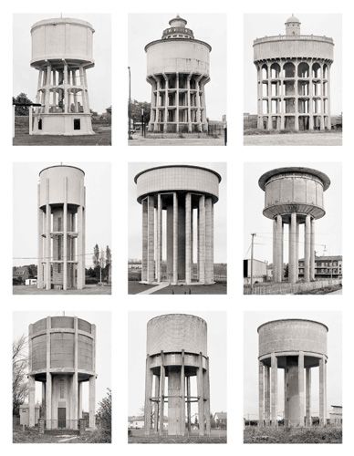 Below are several series of their images, readily found on the web and collected here for ease of access. They are points of departure for your conceptualizing. Note that photography is often touted as truth. In reality photography is always a lie. Or at least, a heavily redacted version of reality. In the case of the Bechers this editing is essential and deliberate.