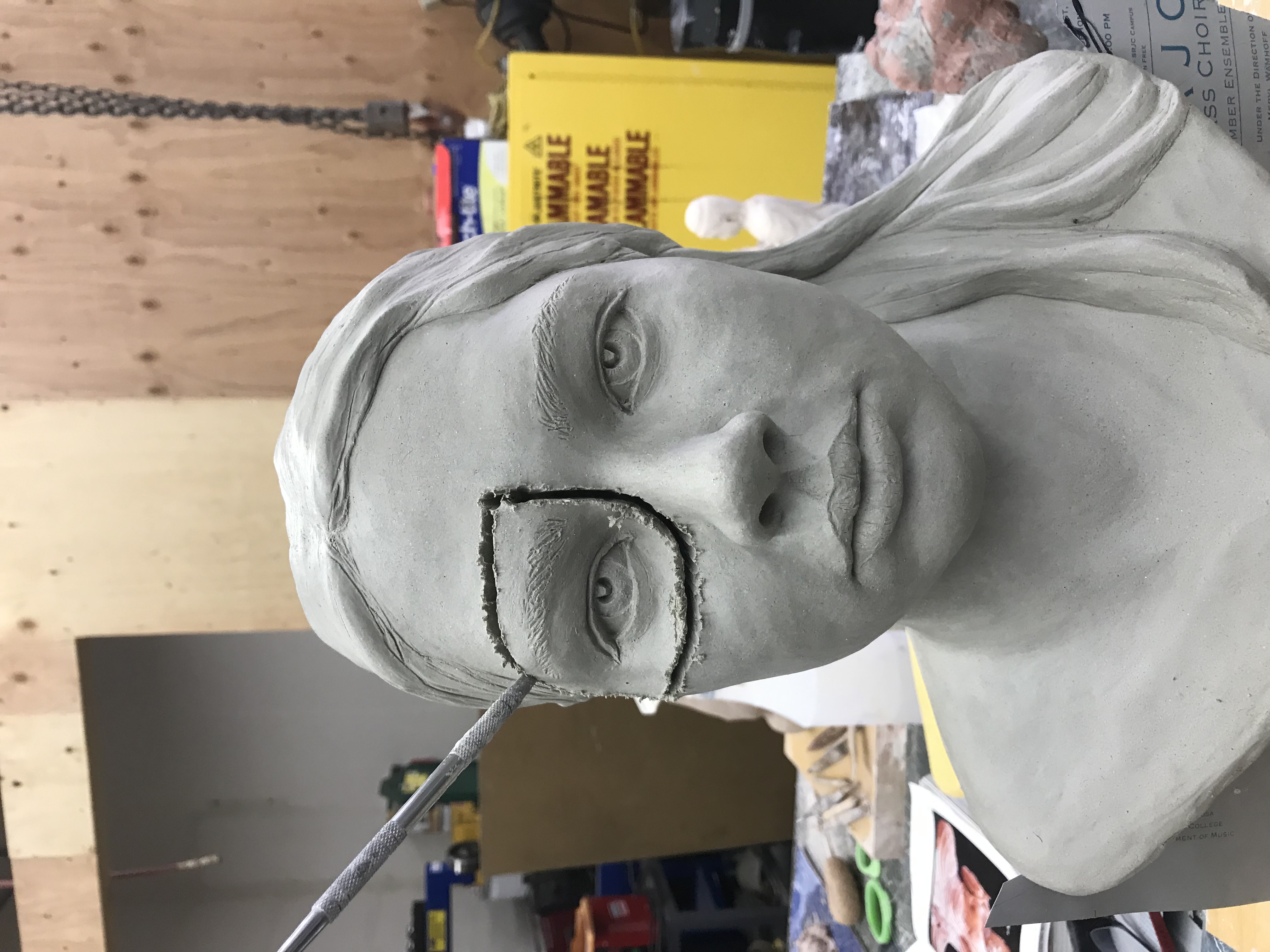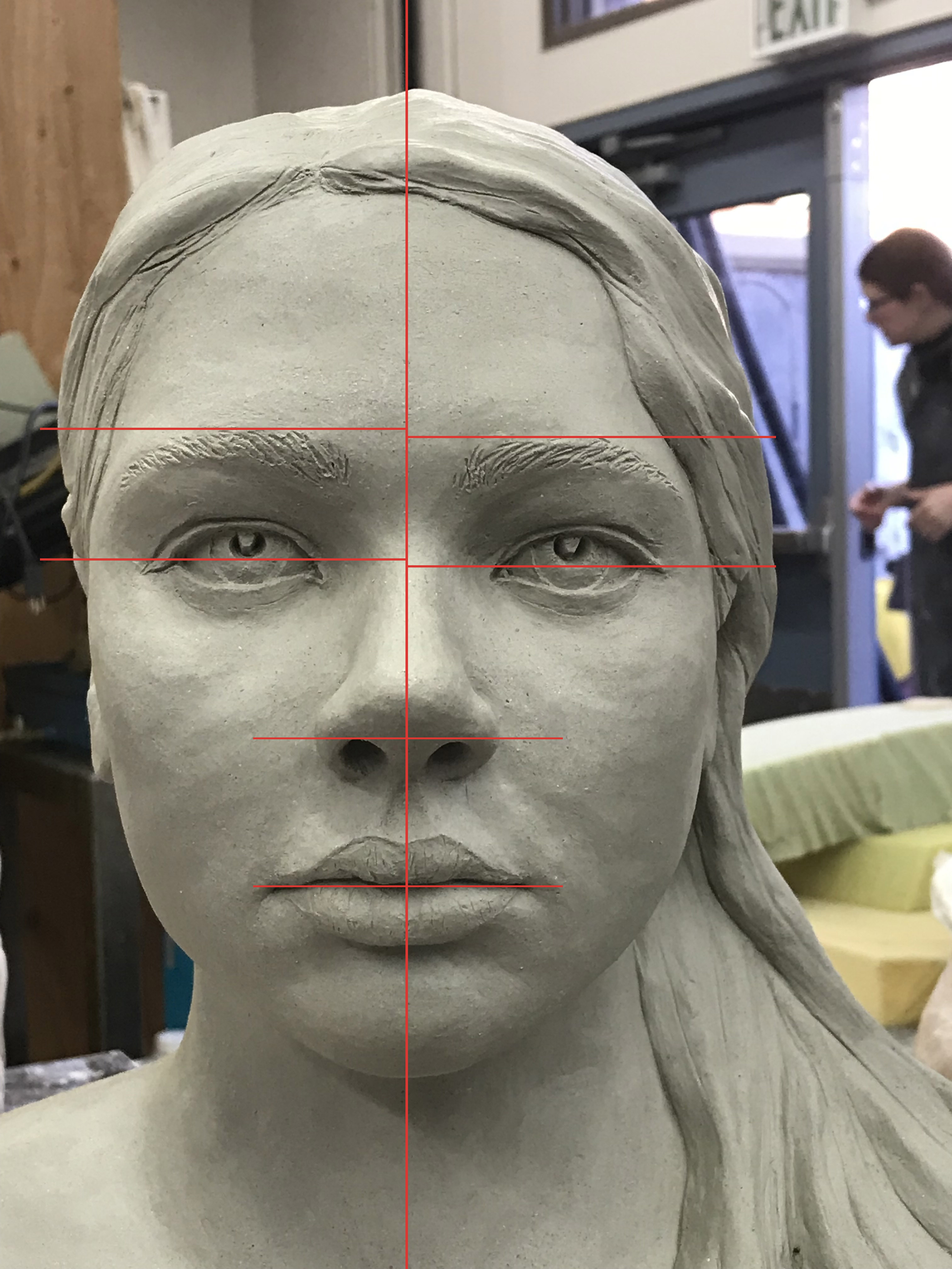 Here a fine example of a bust created by student, Sonia Rued in Beginning Sculpture. She relied on photos of her daughter as reference, as well as some in person observation. The execution was beautifully done, but one subtle problem became apparent as the piece was nearing completion. The eyes were out of alignment. It was determined that the right eye was the one to fix because eyes are typically centered between the bottom of the chin and the top of the head, and the left eye was.