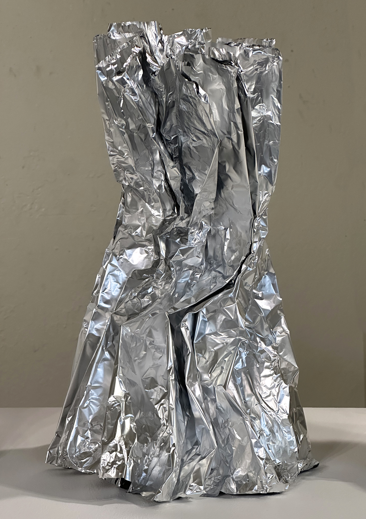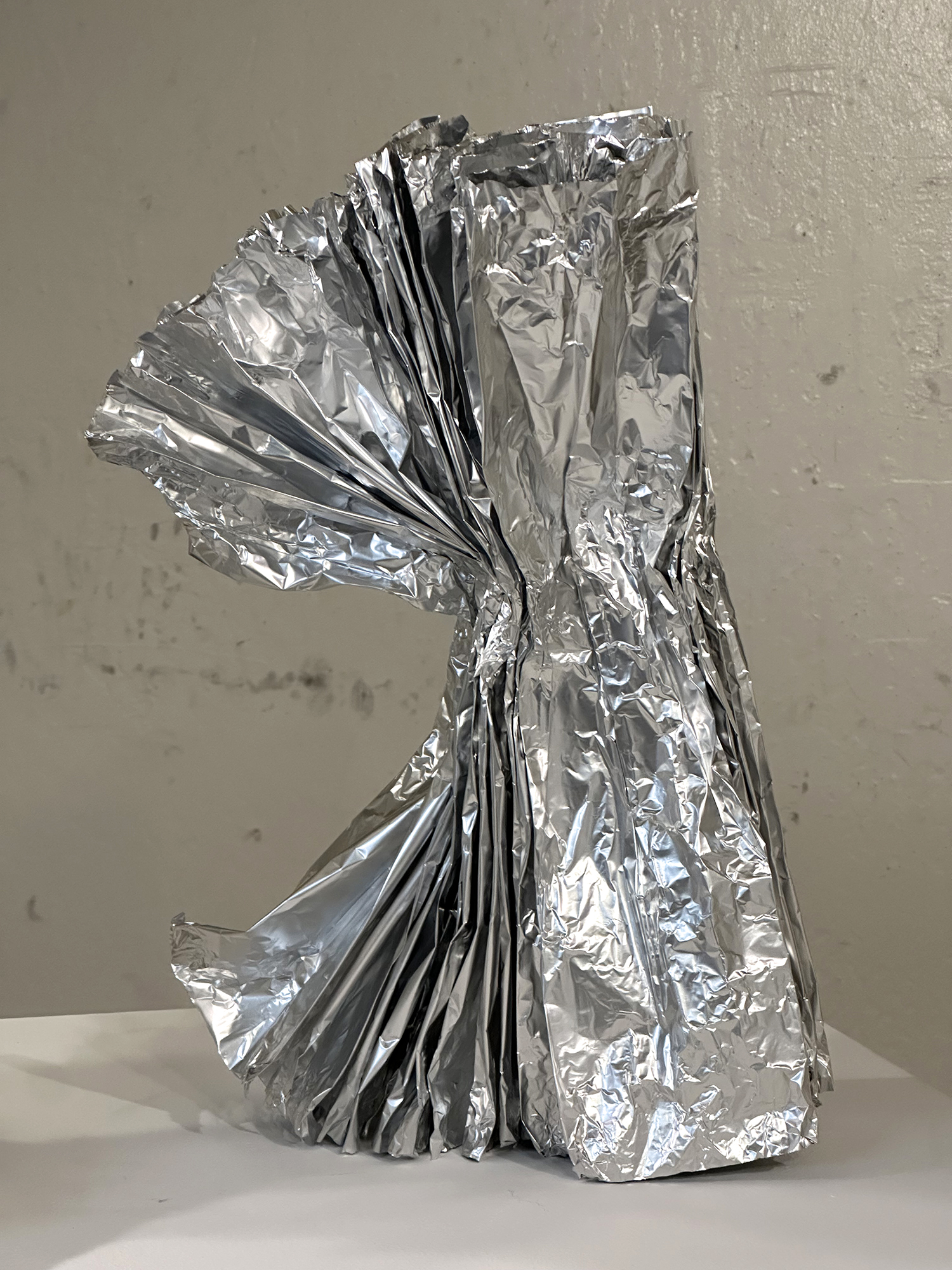 Dennise Sosa was interested in working with textiles, and wanted to experiment with folds and pleats. She played with the idea of crushing and squeezing. All nine of her maquettes were made in one class period from restaurant-grade aluminum foil. The forms were made at the given height of the foil roll. After placing the collection on the floor in the classroom, with no room to view them, we determined that they needed to be seen in a row in an open gallery space.