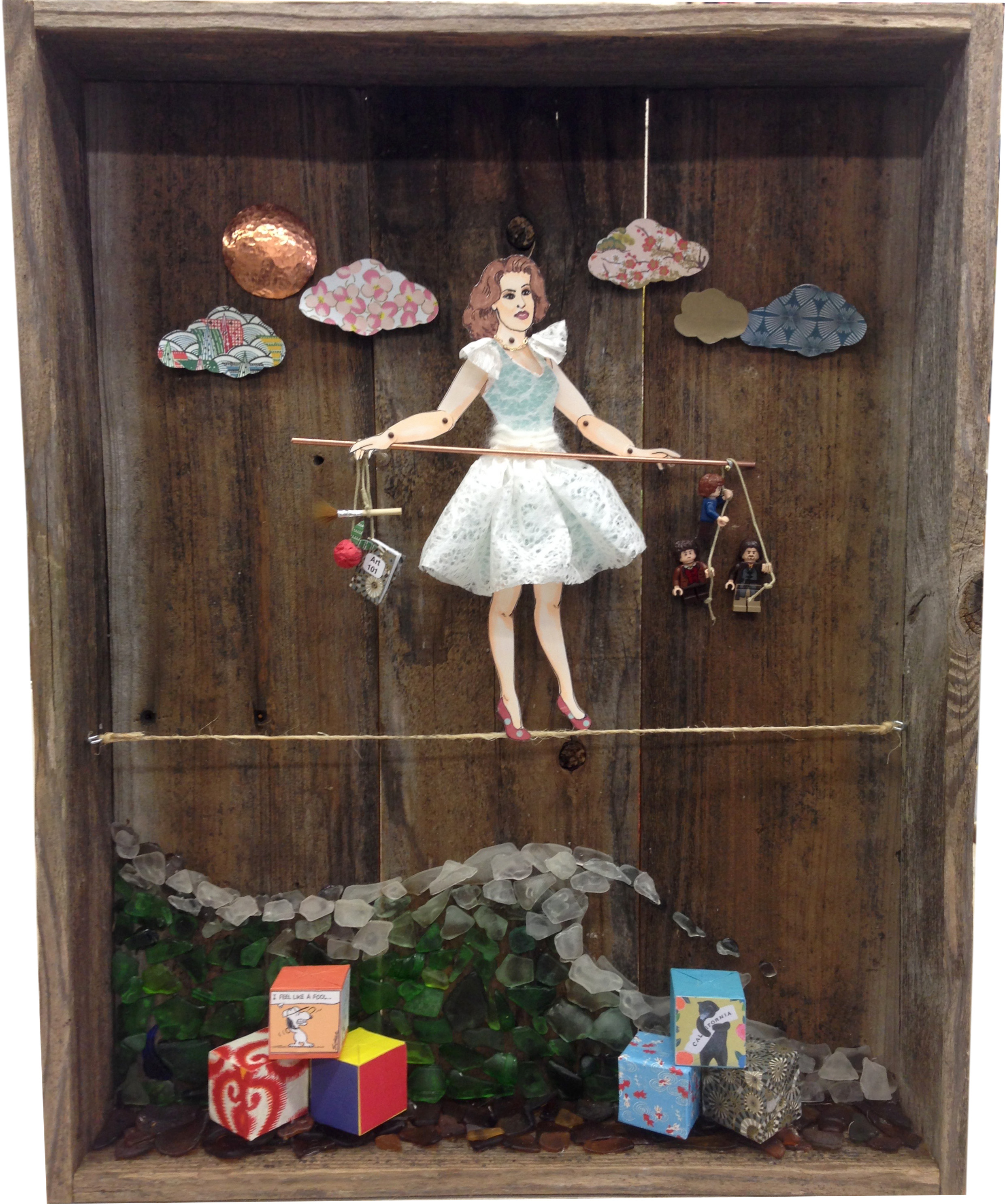 Your assemblage should be intensely personal or meaningful to you. It can hold secrets, be mysterious, and should keep people engaged. A complex story needs depth. Metaphor, obscured imagery, symbols, ritual, and historical reference convey layers of meaning and emotion. A narrative doesn't necessarily need to be literal or linear though; it could be a formal narrative, where the elements convey a visual experience unrelated to other content. In the work, above, the student wished to express her desire to be an artist, and trying to balance that with the needs of her growing family. An interesting element of the work is that she made herself as a paper doll, which articulates. If the string she is balanced on is flexed, her body moves. She is the fulcrum of a scale that starts to lose its balance.