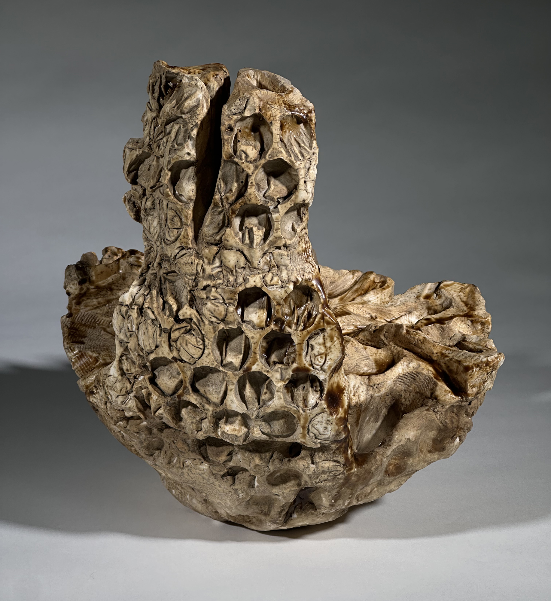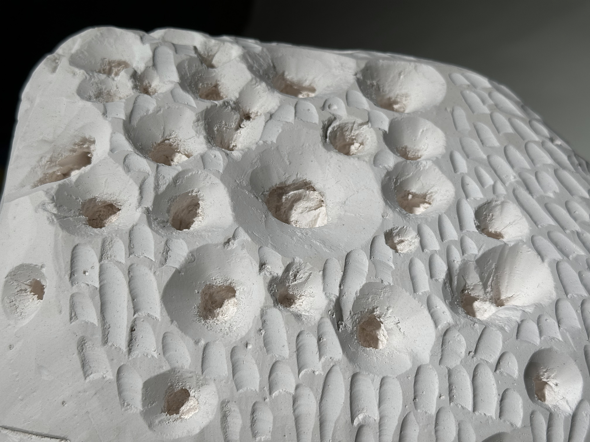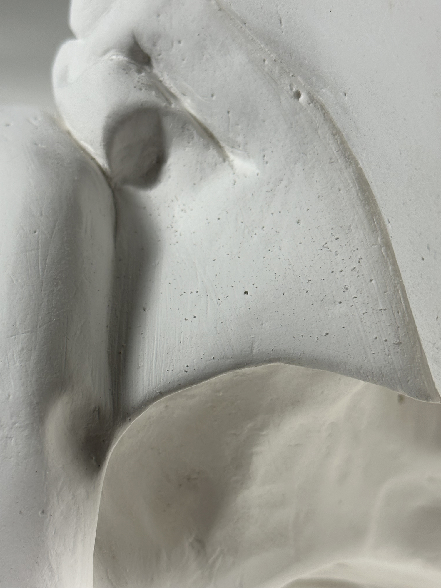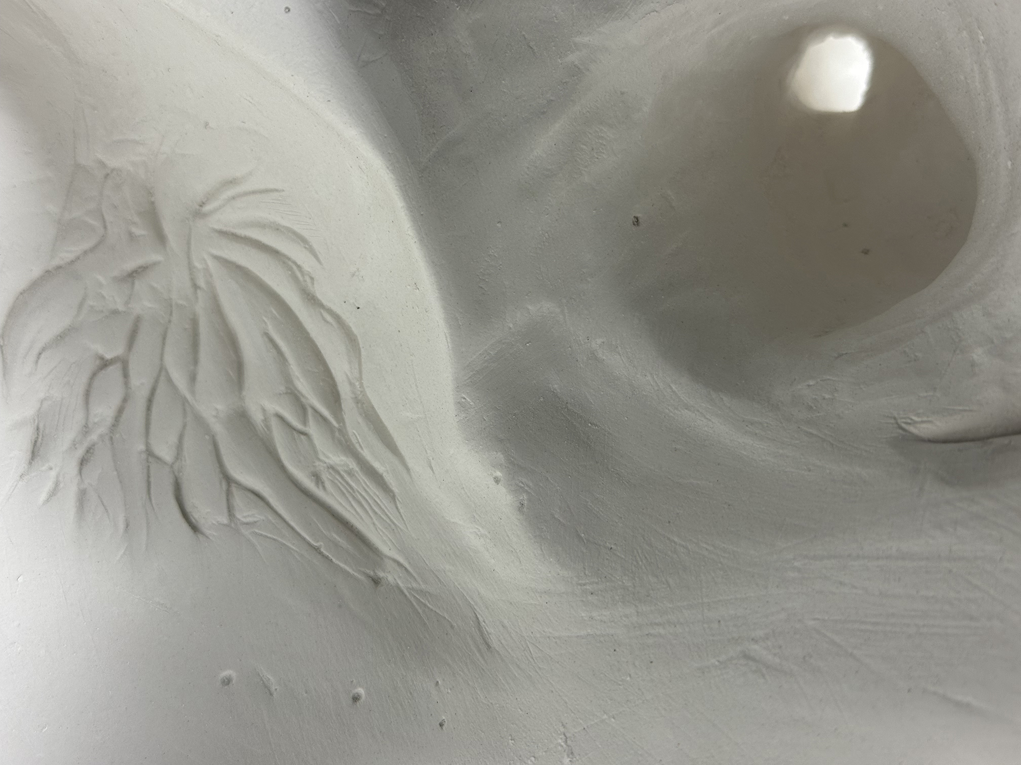 Max Brooks and Tony Avitia put a lot of unique textural details throughout their sculptures, so detailed images are also shown. Dennise Sosa created heavy detail, but it is fairly consistant throughout. Dennise enhanced her texture by melting microcrystalline wax into the plaster, imparting a warm tone and greater contrast. Aalyah Hernandez cast her piece in black polyurethane resin. Crystal Colt cast her pieces in TufStone, while the rest were made with casting plaster.